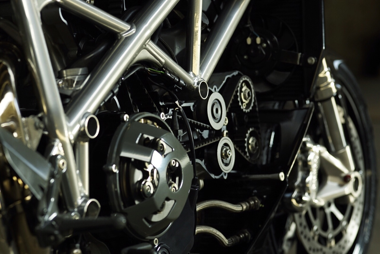 The design elements are very deliberate, dominated by an oversized gas tank with vintage café proportions. Notice how I modified the trellis frame to edge it closer to traditional lines, flowing into an minimalist but comfortable saddle.