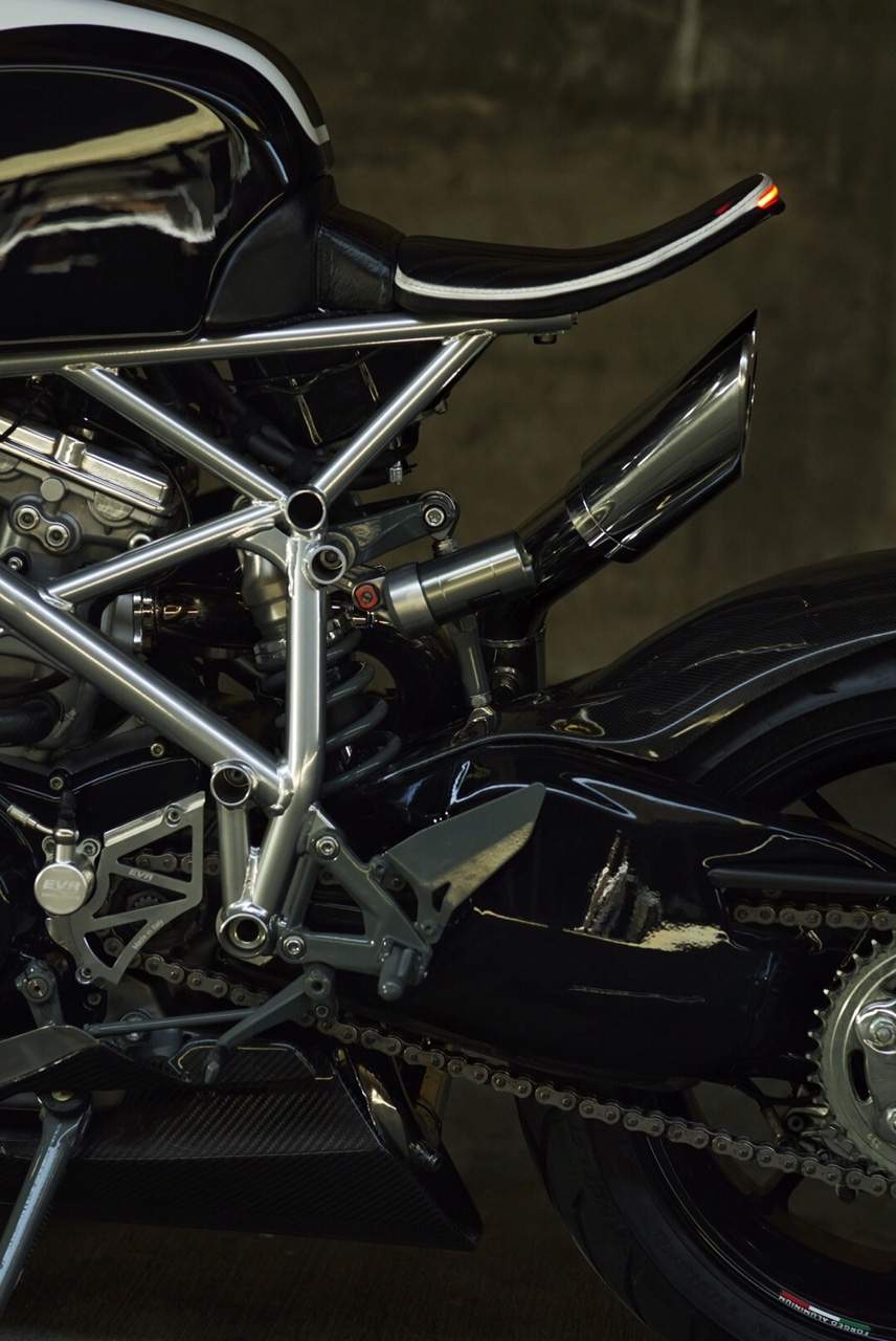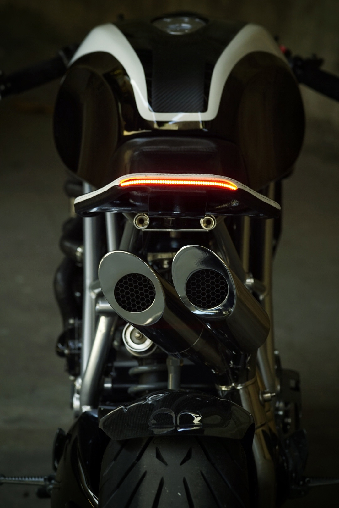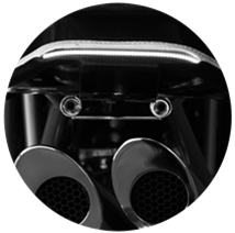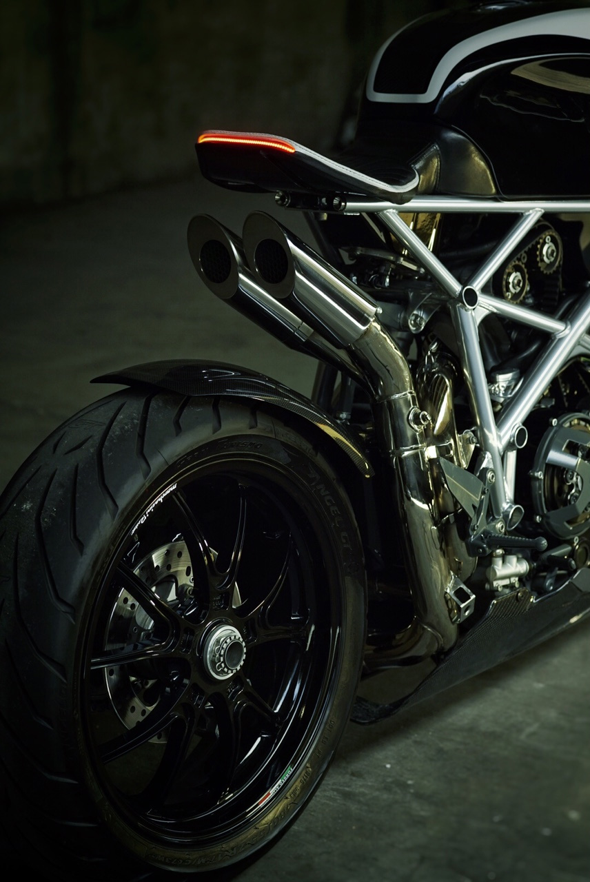 The twin exhausts-handcrafted in stainless steel, mirror the voluptuous curves of the upper bodywork.